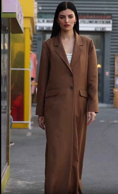A masterful blend of structured tailoring and modest elegance. Designed in a sleek, blazer-inspired silhouette, this abaya exudes confidence and sophistication. The sharp lapels, buttoned front, and full-length cut create a refined and polished look, perfect for both professional settings and upscale occasions. Crafted in a luxurious camel-toned fabric, this abaya is a timeless staple for the modern woman who values both power and grace. Style it with heels for a commanding presence or keep it effortlessly chic with minimal accessories.