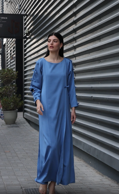 Designed with structured bow details along the sleeves and bodice, this piece combines elegance with a modern touch. Crafted from premium fabric, its flowing silhouette ensures comfort and sophistication, making it perfect for any occasion.