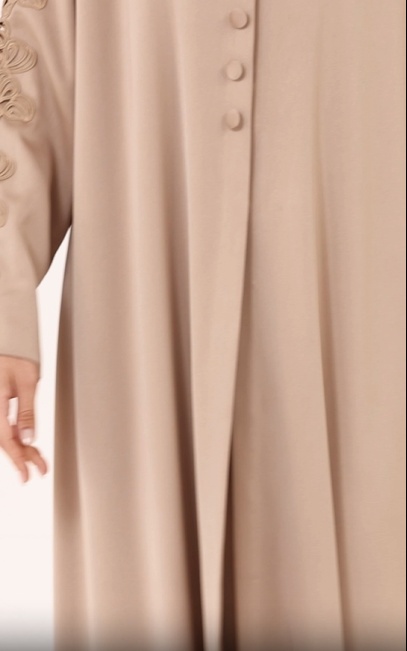A masterpiece of grace and refinement, designed for the modern woman who values elegance with subtle detailing. The delicate floral lace adorning the sleeves adds a touch of femininity, while the structured buttoned front enhances its classic appeal. Crafted from a luxuriously smooth fabric that drapes effortlessly, this abaya offers both sophistication and comfort, making it perfect for special occasions or everyday luxury. Elevate your wardrobe with this timeless statement piece.