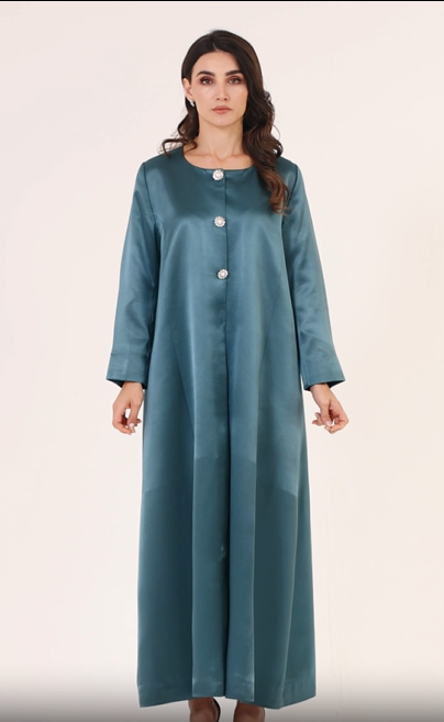 Crafted from lustrous satin , this abaya drapes effortlessly, offering a fluid and graceful movement. The elegant pearl-stone detailed buttons add a touch of opulence, making this piece ideal for refined occasions. With its round neckline, structured long sleeves, and timeless silhouette, this abaya is designed for the modern woman who appreciates understated glamour.